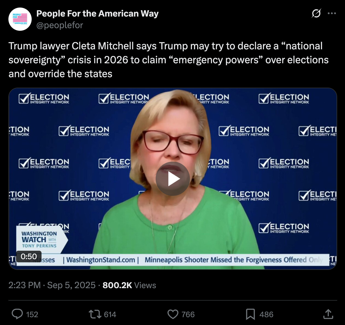 I’m not saying that Mitchell is tipping a hand about anything. As a friend told me late last week, we need to have confidence that courts will do the right thing in any attempts to interfere with the democratic process. I will say that we have to be mindful of the loose justifications for the shredding of the separation of powers. It’s hard to accept that the military is on the ground in American cities when violent crime is at its lowest point in roughly 55 years. Just the same, we need Republicans to begin to push back on narratives like the one coming from Mitchell. Only Congress has power when it comes to federal elections,14 and members of that branch of our government need to speak out.