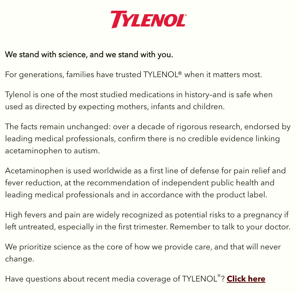 Tylenol isn’t simply taking the beating. The brand is pushing back. This pop-up now appears on its website.