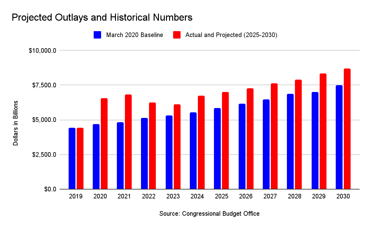What CBO didn’t account for in its June 2017 baseline was pandemic-related spending and the post-pandemic economic recovery. Federal outlays in FY 2020 and FY 2021 were $1.848 trillion and $2.005 trillion higher than the CBO originally projected. Federal spending was still $1.155 trillion higher than the March 2020 baseline in FY 2022, $815.6 billion higher in FY 2023, and $1.228 trillion higher in FY 2024. Federal spending is expected to remain an average of $1.162 trillion higher than the March 2020 baseline through FY 2030.