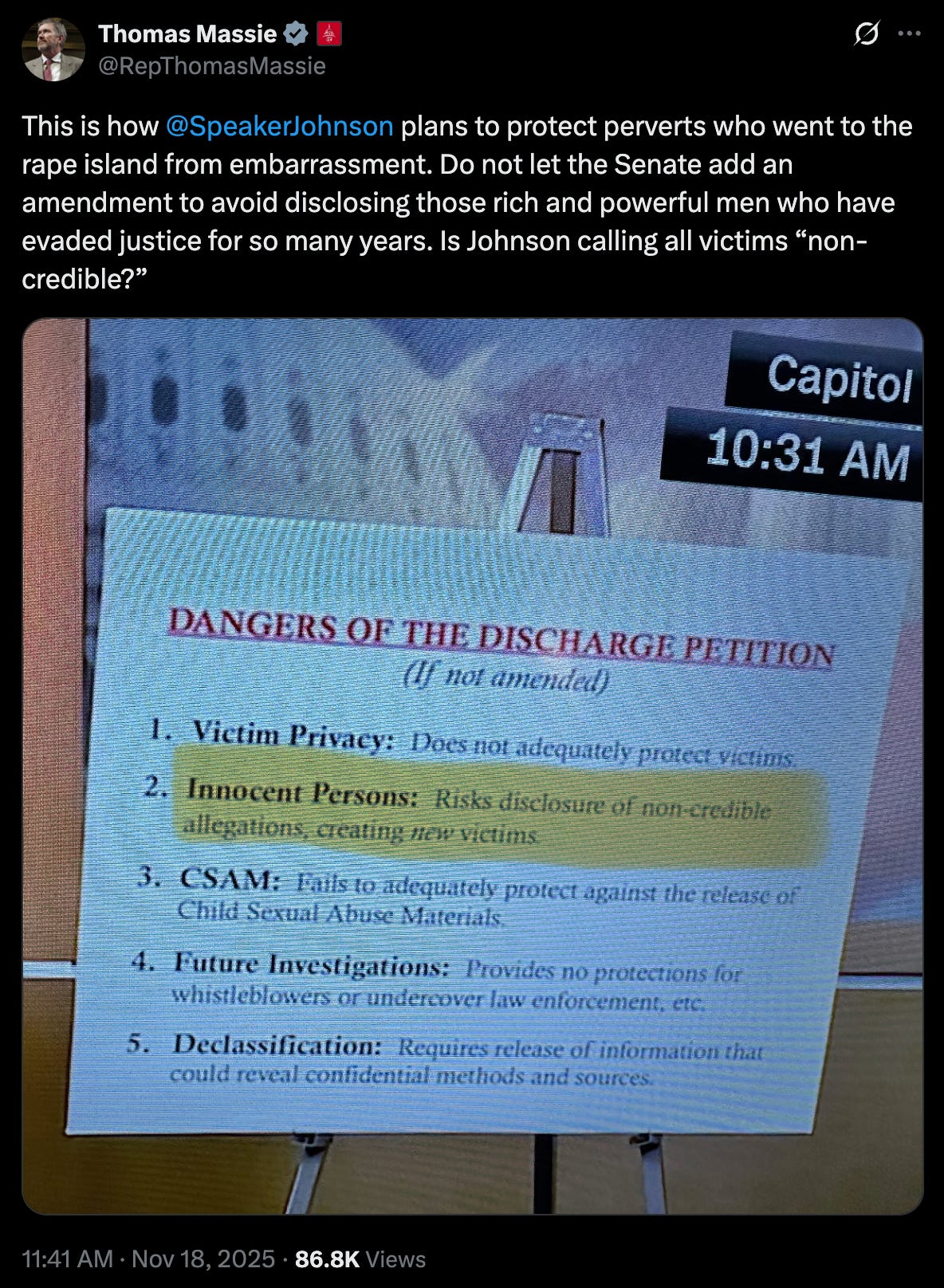 But even as the House is on the cusp of passing the Epstein Files Transparency Act, Johnson is still trying to sabotage the effort. Johnson continues to claim that the legislation lacks protections for victims and “innocent persons”—individuals who may be named in the files that perhaps face “non-credible allegations.” First, the bill includes protections for victims. Also, victims literally appeared at a press conference this morning and demanded passage of the Epstein Files Transparency Act and the release of the files. Second, due process is required in criminal proceedings, but the public has a right to know, because of the magnitude of this situation, who is named in the files and what allegations have been made.