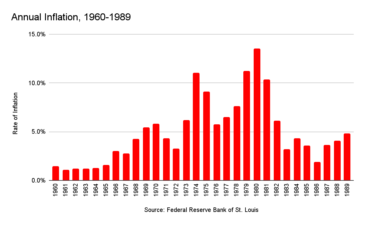 As wage and price controls were lifted and the Federal Reserve increased interest rates, inflation soared from 3.3 percent in 1972 to 6.3 percent in 1973 and 11.1 percent in 1974. In context, inflation in 2019 and 2020 was below the Federal Reserve’s 2 percent target. It jumped to 4.7 percent in 2021 and 8 percent in 2022 before falling to 4.1 percent in 2023.