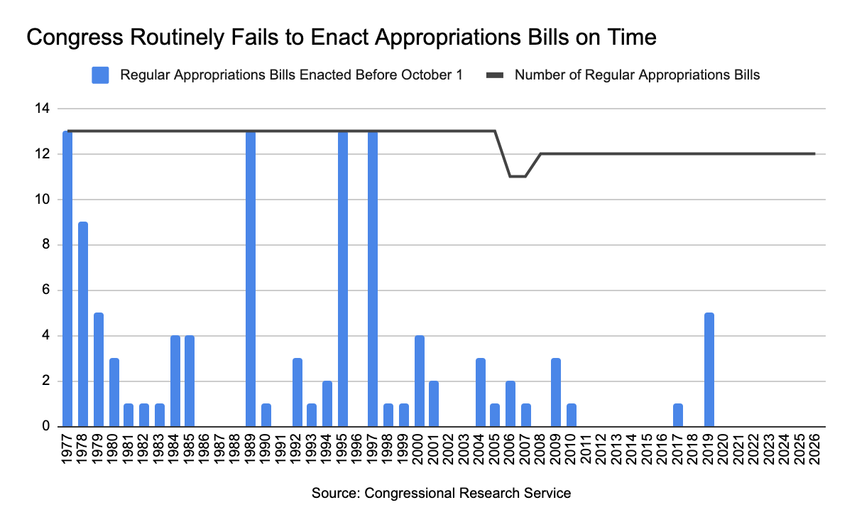The current regime of 12 regular appropriations bills has been around since FY 2008. Since the FY 2008 appropriations cycle, Congress has passed only ten appropriations bills on time. That’s ten out of 228 opportunities. Congress has passed a total of zero–-yes, zero–from the FY 2020 appropriations cycle through FY 2025. This is a fundamental failure of congressional leadership on both sides of the aisle.