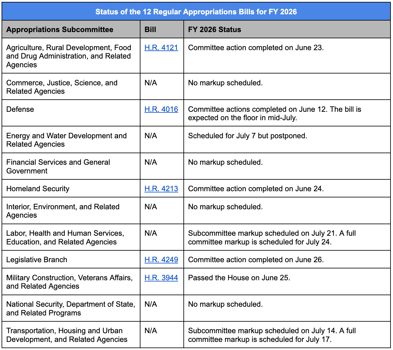 Not a single one of the regular appropriations bills was reported out of the House Appropriations Committee by June 10. Only one–Military Construction, Veterans Affairs, and Related Agencies Appropriations Act for FY 2026, H.R. 3944–passed the House before June 30. To date, the Committee has approved the 302(b) allocations for four of the appropriations bills.4