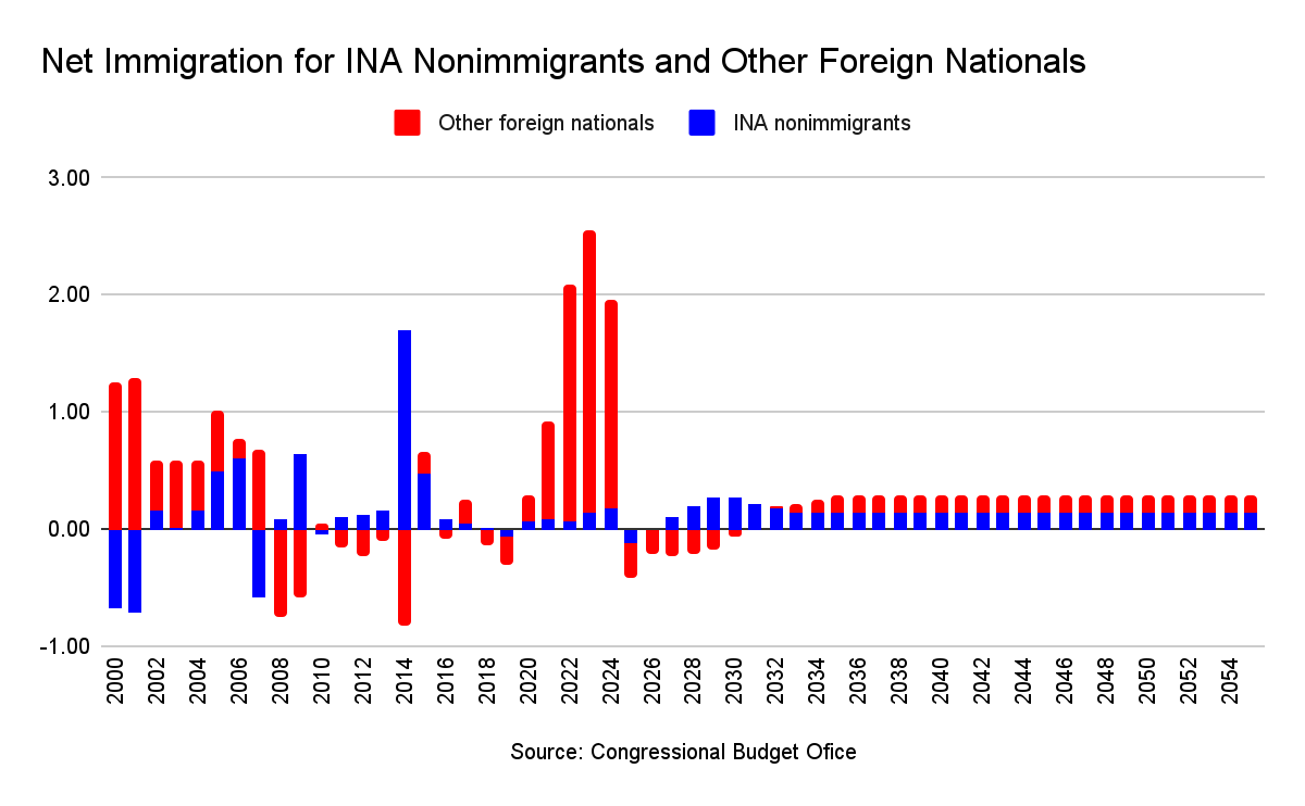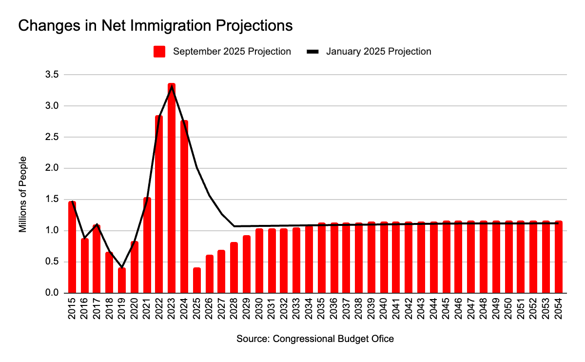 The CBO released the update of its demographic projections to reflect policy changes that have occurred since January. These changes are specifically related to executive orders on immigration and the so-called “One Big Beautiful Bill Act.” The report explains, “Administrative actions taken since January 20, 2025, are the largest factor decreasing CBO’s projections of the number of immigrants in the country. The 2025 reconciliation act (Public Law 119-21) also decreases that number.” Indeed, net immigration to the United States has dramatically declined in 2025. In January, the projection was a little more than a net of 2 million people would immigrate to the United States. That has been revised to 408,000. The figure is expected to slowly notch up to 1 million in 2030 and eventually to 1.2 million in 2044.