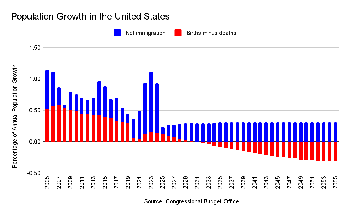 In January, the Congressional Budget Office (CBO) released its annual demographic projections. The data showed that the United States will see more deaths than births among the native-born population in 2033. The CBO released an update to those projections in September. The agency is now projecting that the nation will see more deaths than births in 2031.