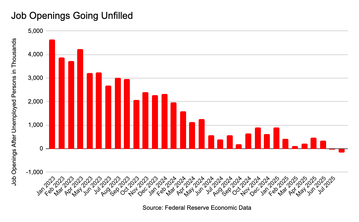 The prime working-age population will increase by around 1.58 million people from 2025 through 2054. That’s about 4.4 million fewer than the CBO projected we’d see in this population back in January. This is a bad sign. Although the economy hasn’t lived up to expectations in recent months, prior to July, there was a significant number of job openings on the market. This was something we saw in the economy on a consistent basis beginning in March 2018 until the pandemic began in March 2020.