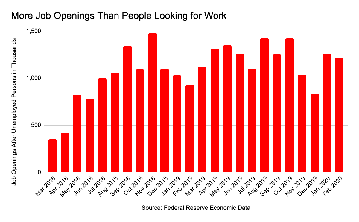 Here’s the more recent look. When the economy recovers from whatever we’re experiencing right now, we’ll likely see the same pattern emerge. Job openings will likely outpace the number of unemployed people seeking work.